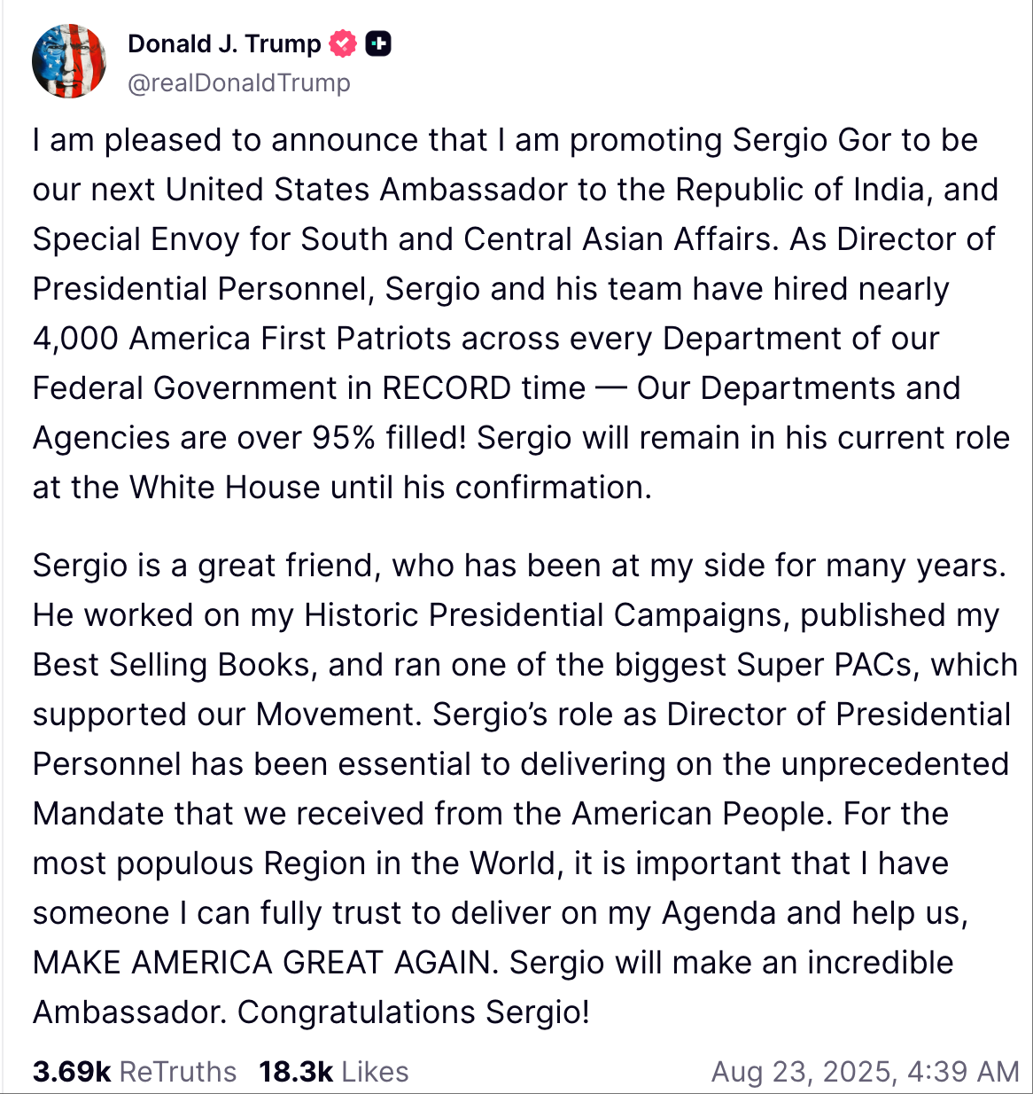 “对于这个世界上人口最多的地区,我必须派遣一位我完全信任的人来贯彻我的议程,帮助我们让美国再次伟大。”特朗普在社交媒体平台“真实社交”上发文说:“塞尔吉奥是我的挚友,多年来一直陪伴在我身边。”“塞尔吉奥将会是一位出色的大使。”