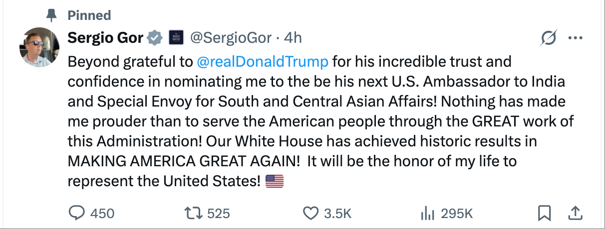 戈尔感谢特朗普提名他为驻印度大使并将该帖文置顶。